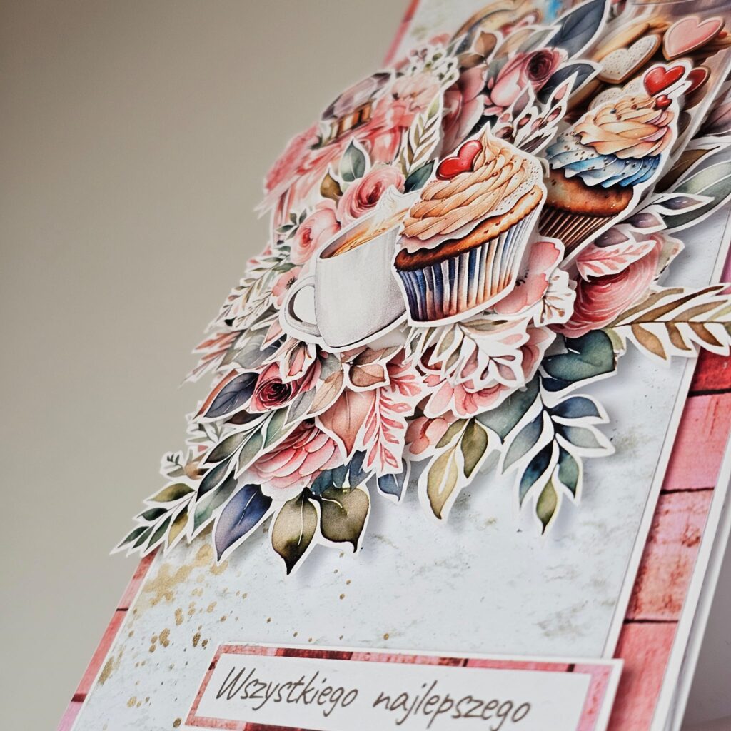 Ta piękna kartka okolicznościowa to doskonały wybór na każdą okazję. Jej elegancki design i starannie wykonane detale sprawiają, że jest wyjątkowa i niezapomniana. Kartka ozdobiona jest kwiatowymi motywami, słodkimi babeczkami, serduszkami oraz kubkiem kawy, co nadaje jej ciepły i przytulny charakter. Na froncie znajduje się napis „Wszystkiego najlepszego”, który idealnie pasuje do urodzin, imienin, rocznic i innych ważnych wydarzeń.